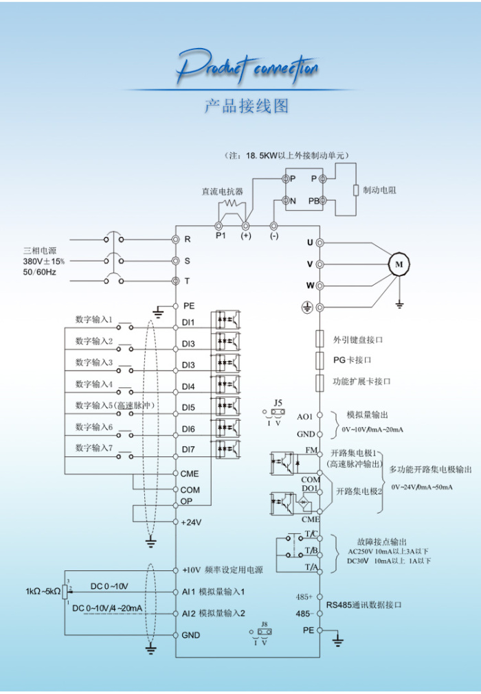 4.多種速度控制方式:模擬量輸入0-5VDC,0-10VDC,0/4-20mA;面板電位器調(diào)速(更改參數(shù)可設(shè)置上下按鍵調(diào)速);外接電位器調(diào)速;可通過485通訊調(diào)速。